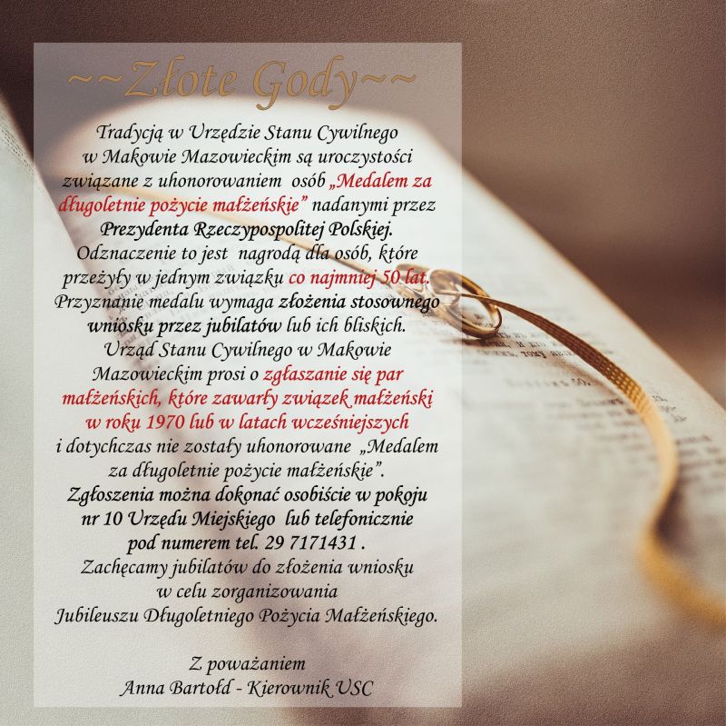 ZŁOTE GODY - ZAPRASZAMY PARY MAŁŻEŃSKIE DO SKŁADANIA WNIOSKÓW