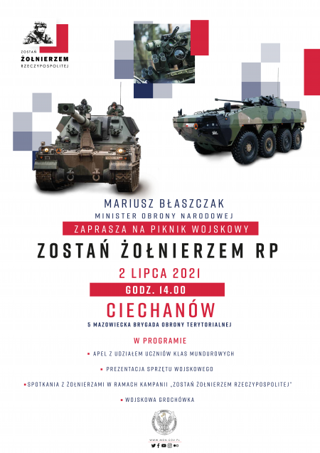 2021.06.302 lipca 2021 roku o godzinie 14:00 w Ciechanowie odbędzie się piknik wojskowy.